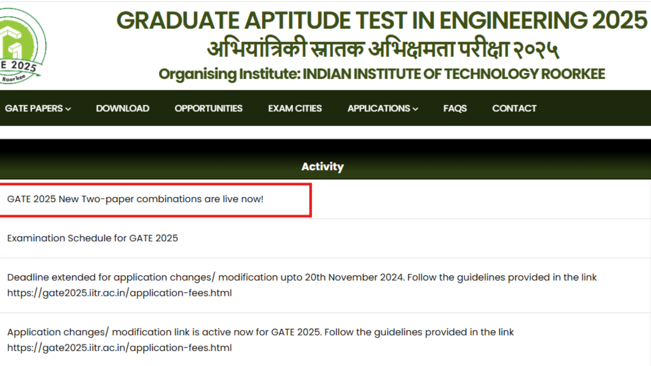 IIT Roorkee, conducting GATE 2025 on February 1, 2, 15, and 16, has introduced new two-paper combinations. Registered candidates can select from these options on the official website between November 14 and 20. Candidates may choose one or two papers but must adhere to the combinations listed on the website.< a href="https://timesofindia.indiatimes.com/education/news/gate-2025-iit-roorkee-introduces-new-two-paper-combinations-check-the-full-list-here/articleshow/115355393.cms">READ MORE