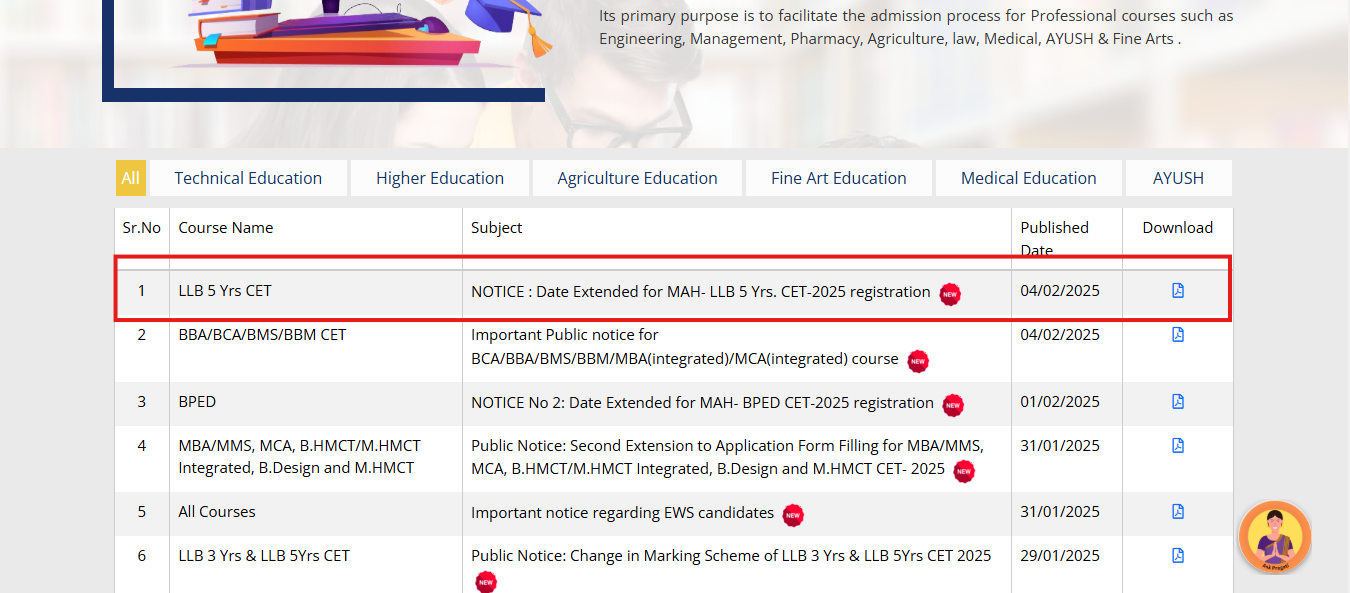 The Maharashtra State Common Entrance Test Cell has extended the MAH LLB CET 2025 registration deadline until February 18, 2025, considering requests from candidates and parents. Eligible applicants can apply online at mahacet.org. The registration process involves filling in personal details, submitting the form, and completing the payment. Candidates are advised to keep a hard copy for future reference.< a href="https://timesofindia.indiatimes.com/education/news/mah-llb-cet-2025-registration-date-extended-check-revised-application-deadline-and-other-details-here/articleshow/117932223.cms">READ MORE