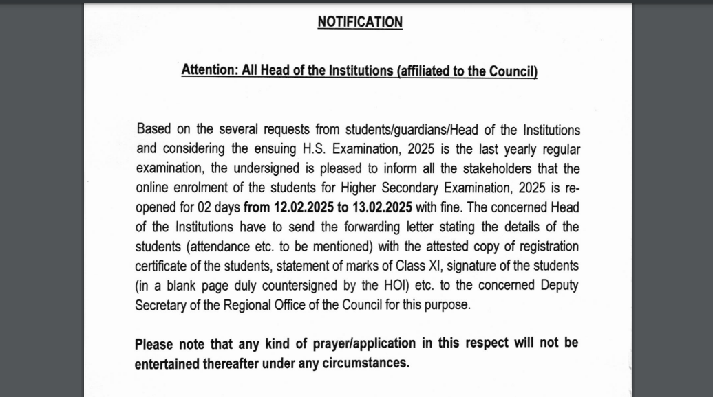 The West Bengal Council of Higher Secondary Education (WBCHSE) has announced a two-day reopening of the 2024 registration window for the 2025 Higher Secondary Examination, allowing late enrolment with a fine. This decision follows multiple requests from students, parents, and school heads. The registration will be open on February 12 and 13, 2025, and must be completed with required documents.< a href="https://timesofindia.indiatimes.com/education/news/west-bengal-hs-exam-2025-wbchse-to-open-online-enrolment-again-check-important-details-here/articleshow/118001852.cms">READ MORE