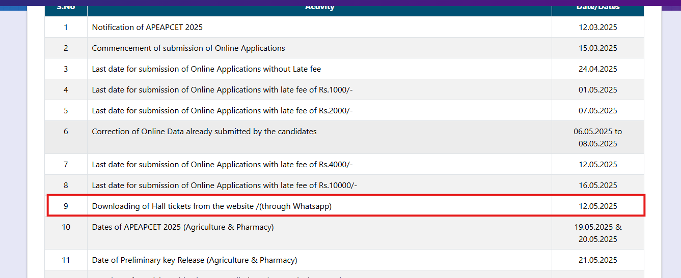 The AP EAMCET 2025 hall ticket will be released on May 12, 2025, at cets.apsche.ap.gov.in. Candidates must log in using their credentials to download it. The admit card is mandatory for entry to the exam hall. The Agriculture stream exams are on May 19–20, while Engineering exams will be held from May 21 to 27.< a href="https://timesofindia.indiatimes.com/education/news/ap-eamcet-hall-tickets-to-release-today-check-steps-to-download-admit-cards-here/articleshow/121094374.cms">READ MORE