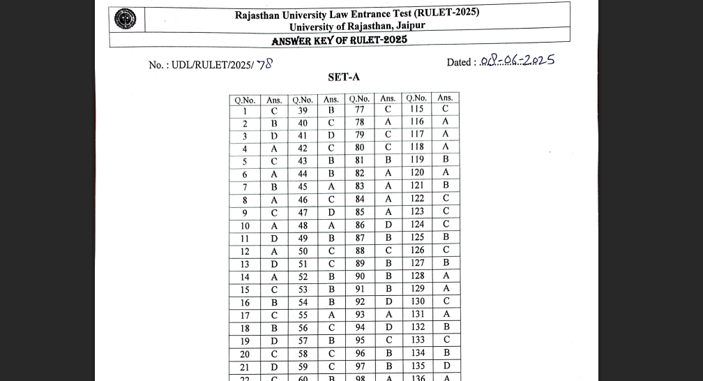 RULET 2025 Answer Key Released: The University of Rajasthan has published the provisional answer key for the Rajasthan University Law Entrance Test (RULET) 2025. Candidates can download it from the official website — admissions.uniraj.edu.in. Objections, if any, must be submitted in hard copy at the Law Department, Jaipur, on June 9 or 10 during office hours.< a href="https://timesofindia.indiatimes.com/education/news/rulet-answer-key-2025-released-direct-link-to-download-here/articleshow/121716152.cms">READ MORE
