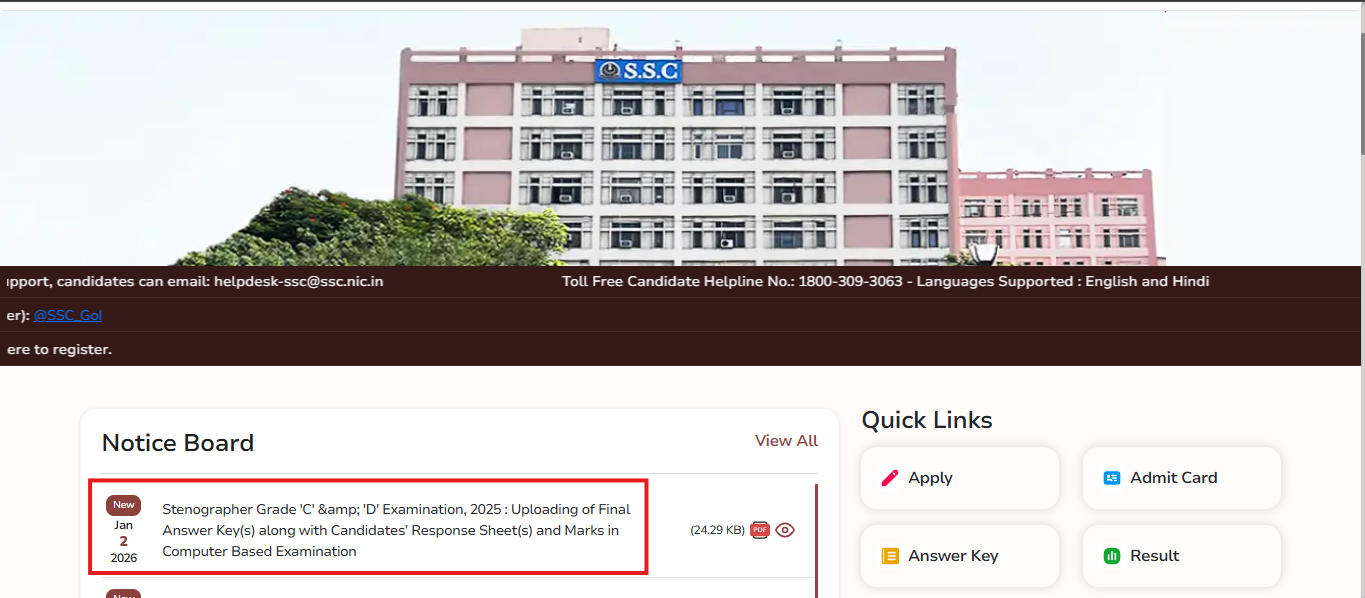 The Staff Selection Commission has released the final answer keys, response sheets, and marks for the Stenographer Grade C and Grade D Examination 2025. Candidates can access these documents on the official website, ssc.gov.in. The results were declared earlier on November 28, 2025. All details will be available until January 17, 2026.< a href="https://timesofindia.indiatimes.com/education/news/ssc-stenographer-grade-c-and-d-final-answer-key-response-sheets-released-at-ssc-gov-in-direct-link-to-download-here/articleshow/126316159.cms">READ MORE