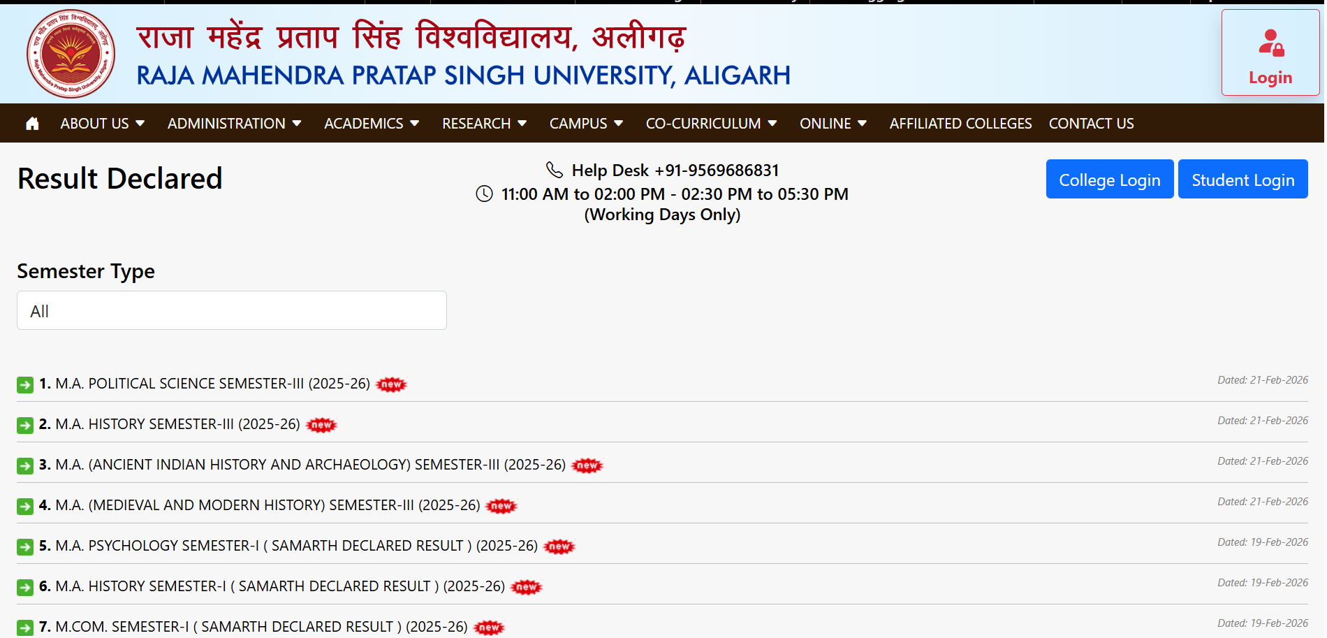 Raja Mahendra Pratap Singh University has released postgraduate results for the 2025–26 session, including Semester-III M.A. scores in key humanities subjects and Semester-I results under the Samarth system. Published between February 19 and 21, 2026, the results are available online. Students can access and download their marksheets through the “Result Declared” section on the official portal.< a href="https://timesofindia.indiatimes.com/education/news/rmpsu-result-2026-released-at-rmpssu-ac-in-direct-link-to-download-here/articleshow/128697650.cms">READ MORE