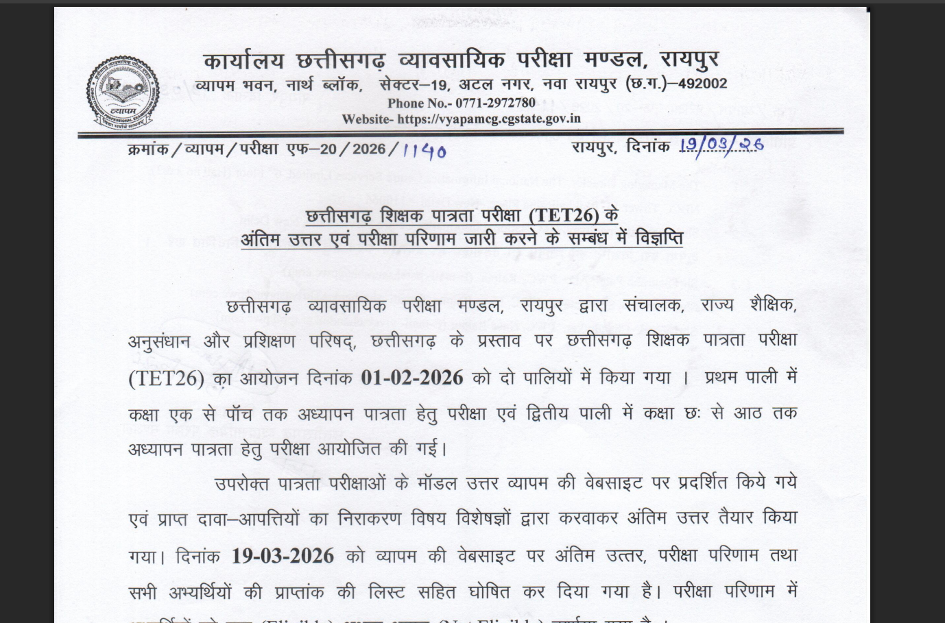 The Chhattisgarh Professional Examination Board has released the CG TET Result 2026 online, enabling candidates to check their scorecards through the official portal using login credentials. The state-level exam determines eligibility for primary and upper primary teaching roles. Candidates can download results and must verify key details mentioned on the scorecard carefully.< a href="https://timesofindia.indiatimes.com/education/news/cg-tet-result-2026-released-at-vyapam-cgstate-gov-in-direct-link-to-download-scorecards/articleshow/129690658.cms">READ MORE
