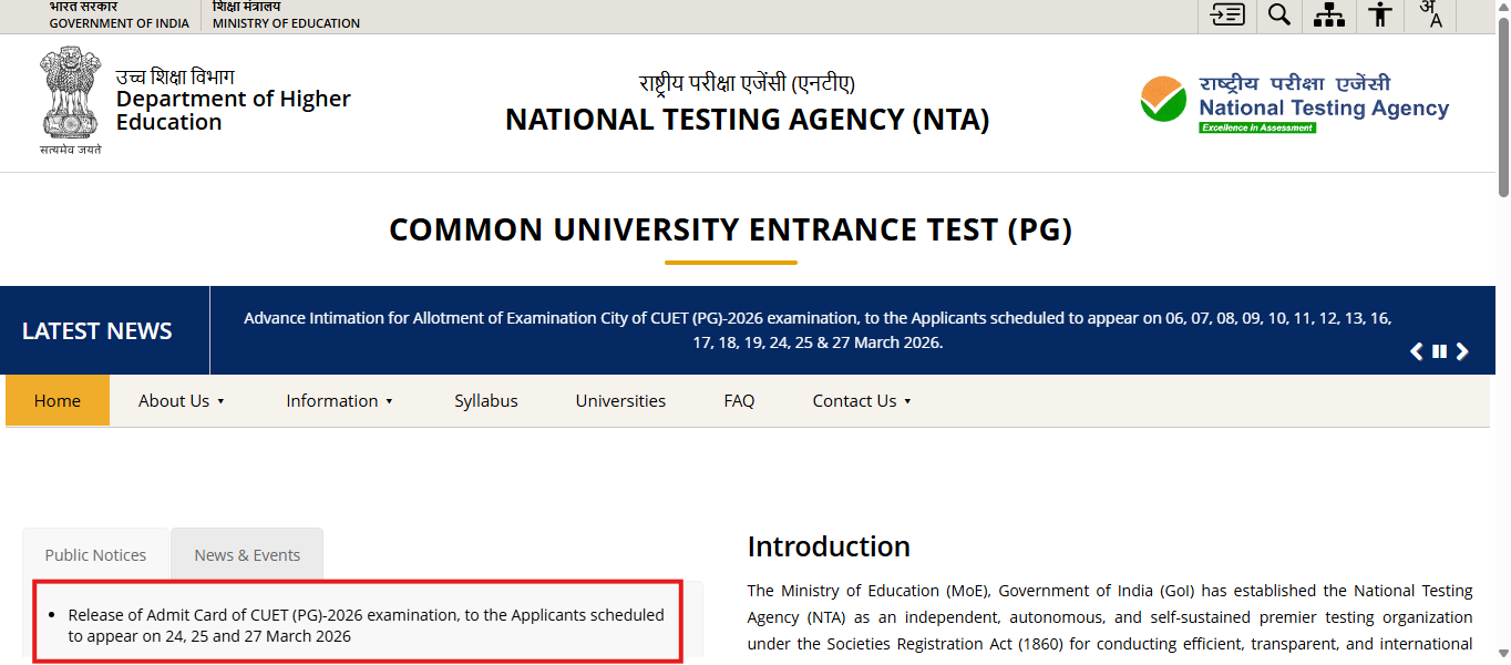 The National Testing Agency (NTA) has released CUET PG 2026 admit cards for exams on March 24, 25, and 27. This completes the issuance of hall tickets for all scheduled exam dates. Candidates can download their admit cards from the official website and must carry a printed copy with a valid photo ID.< a href="https://timesofindia.indiatimes.com/education/news/cuet-pg-2026-admit-card-released-for-march-24-25-27-exams-at-exams-nta-nic-in-direct-link-to-download-hall-tickets-here/articleshow/129668985.cms">READ MORE